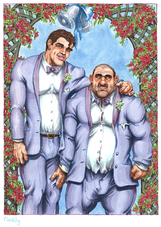 Finally With all the talk of same sex marriage, I figured I'd finally do my take on the ceremony. I'd like to have put a lot more layers of color into the nuptials, but as some might be aware, I'm "in transit" and don't have access to 90% of my markers or equipment. Still, I think this piece pretty perfectly represents the central concept I had going in to it. I like these guys. I like that the shorter groom feels out of his element and is surreptitiously clutching his partner for reassurance. Don't know if the marriage will last but the first three years should be great fun. — Michael Kirwan